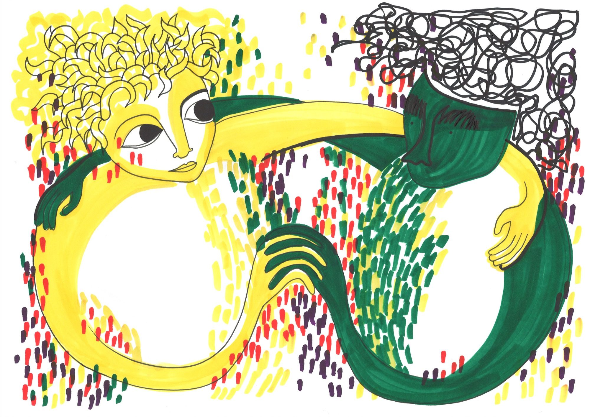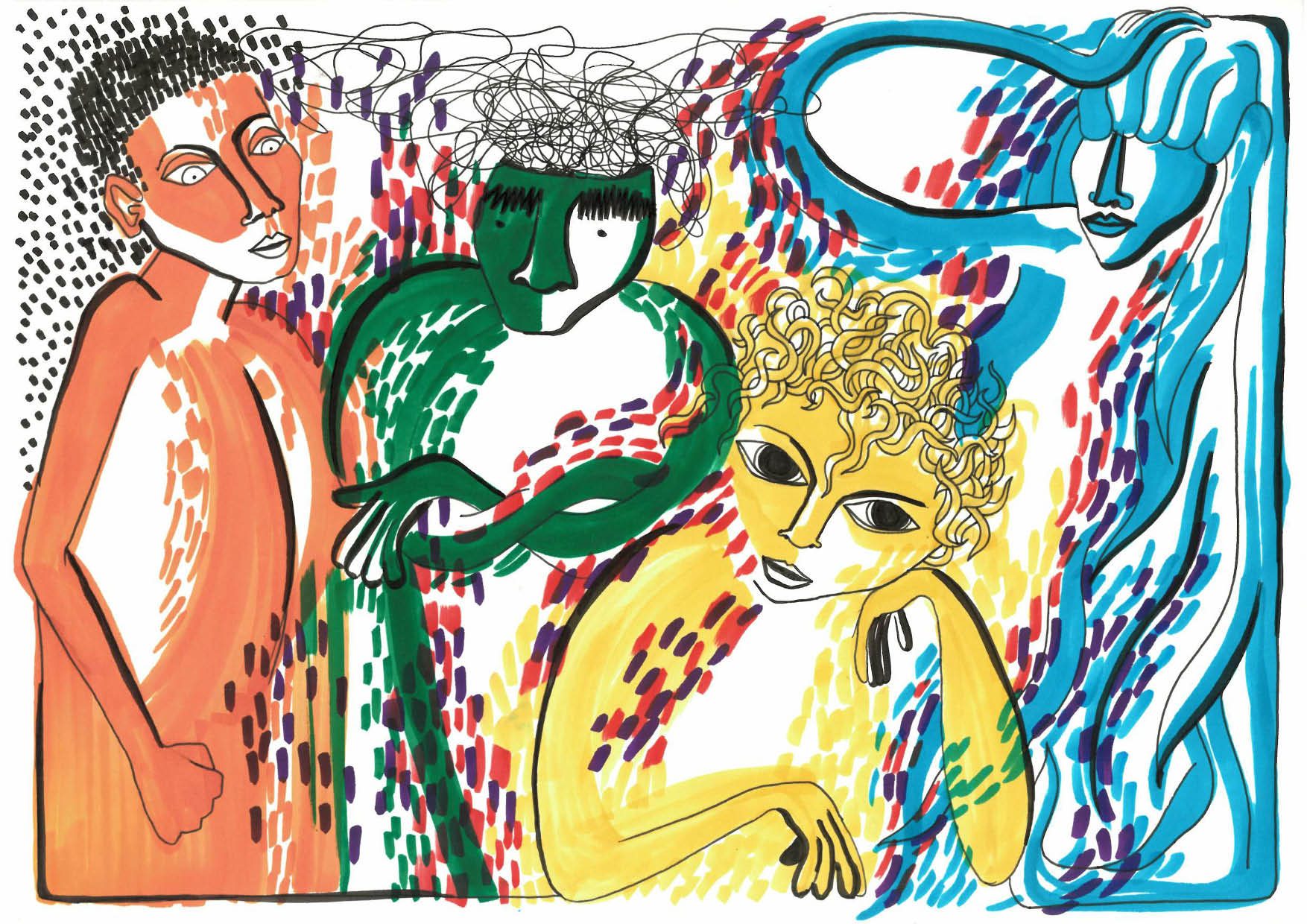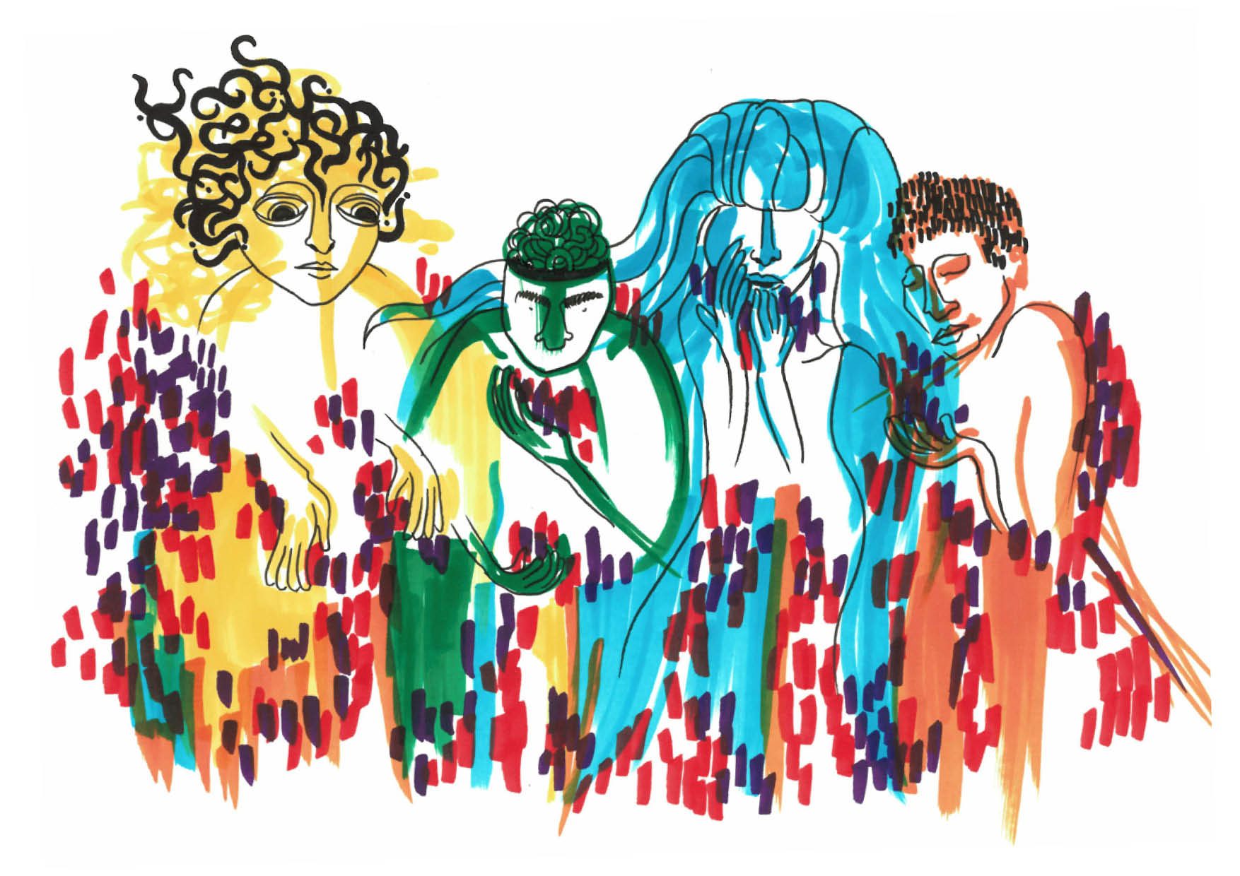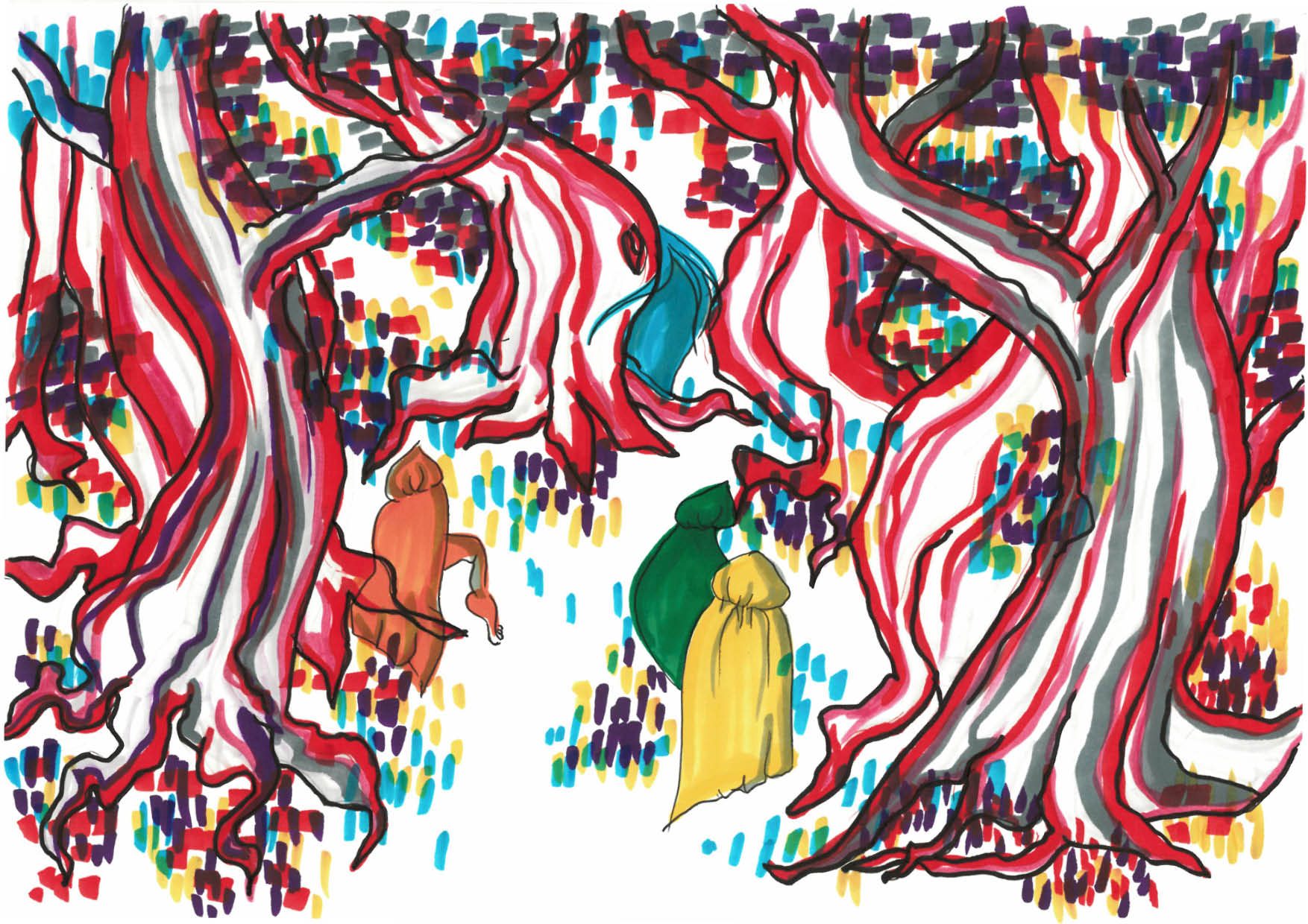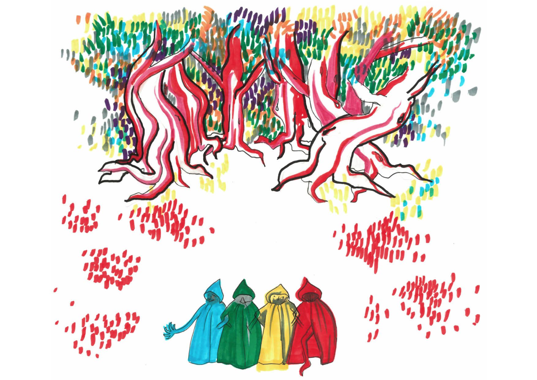 Dans le cadre d'un atelier de composition au conservatoire de Nîmes, j'ai illustré un conte musical pour enfant qui raconte la quête de quatre personnages qui rencontrent une entité magique à qui on peut demander à ce qu'un voeu se réalise.